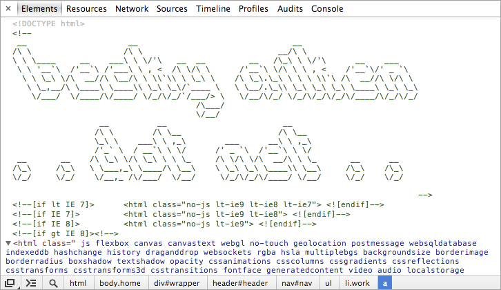 I wrote the code for this website using the Coda text editor. My super-cool ASCII text was made using the Text to ASCII Art Generator. The HTML backbone comes from the HTML5 Boilerplate, and uses Normalize.css and Modernizr.js. Page transitions were implemented by Scott, using the jQuery library and History.js. While developing, I made heavy use of the CSS Terminal bookmarklet, the ColorZilla extension, and the Web Developer extension. Throughout the web design process, I often consulted CSS Tricks, Stack Overflow, Codrops, W3Schools, and Web Safe Colors.
